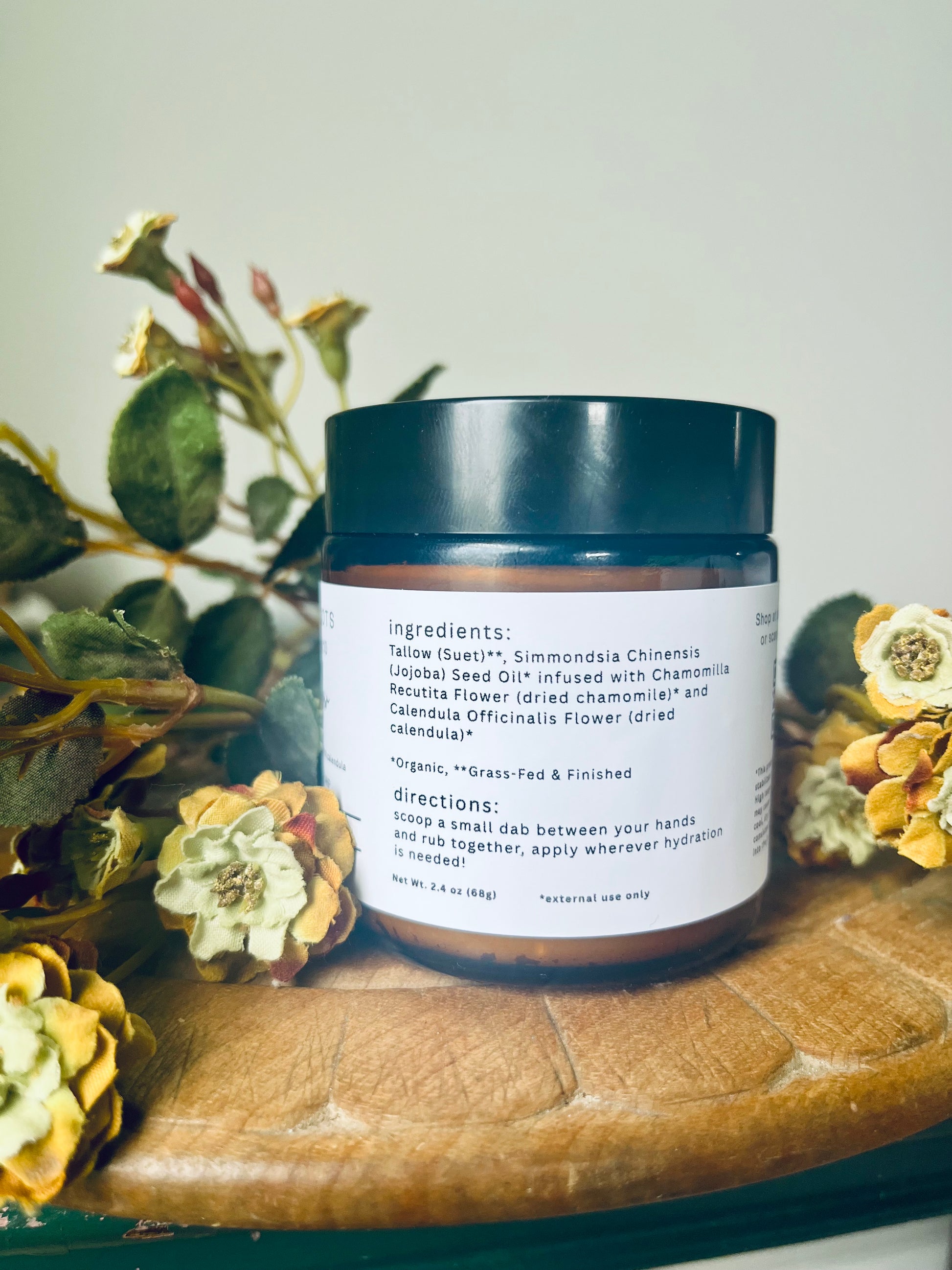 Hand rendered grass fed, grass finished suet tallow, organic jojoba oil infused with organic dried calendula and chamomile flowers.